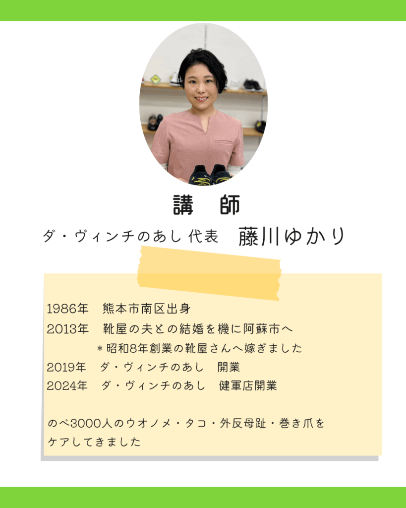 熊本県熊本市のドイツ式フットケアサロン「ダ・ヴィンチのあし」代表、足と靴の専門家としてこれまでに3,000人以上の足の悩みに向き合い、施術を行ってきました。