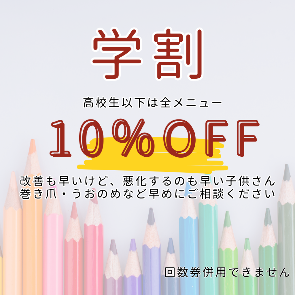 2024年1月〜価格改訂・学割・回数券始めます 2023 12/06 お知らせ 2023年12月6日 よろしくお願いいたします! お知らせ うおのめ たこ シューフィッター 巻き爪 痛い 足が痛い 2023年12月営業日のお知らせ|熊本,阿蘇,巻き爪,うおのめ,ドイツ式フットケア ドラッグストアで買える巻き爪用ニッパー(爪切り)の使い方 関連記事 【外反母趾が痛い!】ドラッグストアで今すぐ対策!青木孝文医師提唱の「包帯療法」を応用する方法 2025年11月5日 2025 秋 入荷情報 2025年10月9日 【2025年9月 近況報告】夏の疲れリセット!「脳疲労ケア」人気と佐賀ショートトリップ 2025年9月26日 9割の人が知らない頭汗・顔汗の悩みを解決する方法! 2025年9月19日 足が燃えるように熱い!それ、バーニングフィート症候群かも?原因と対策【何科を受診?】 2025年8月31日 YouTube動画で逆効果?体を痛める前に知ってほしい「体の声」の聞き方 2025年8月8日 2025 シンプルなリボンバレエ入荷 2025年7月25日 🦶足裏のガサガサ、乾燥だけじゃない!タンパク質不足が原因かも?🤔 2025年7月18日